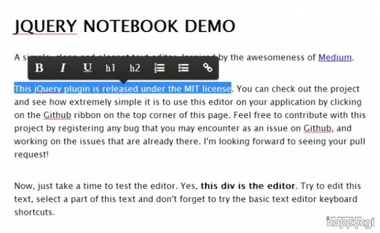 JQUERY NOTEBOOK 은 심플한 웹기반 텍스트 에디터 입니다. 홈페이지에 간단한 방명록에 텍스트 에디터를 장착하고 싶으실 경우 유용하게 쓰일 것 같습니다. 첨부파일을 다운받으신 후에 실행해 보시면 됩니다. 일반 위지윅 에디터처럼 상단에 도구가 있는 것이 아니라, 입력한 테스트를 SHIFT 또는 마우스로 드레그하면 드레그 영역 상단에 자그마한 에디터 도구들이 활성화가 됩니다.